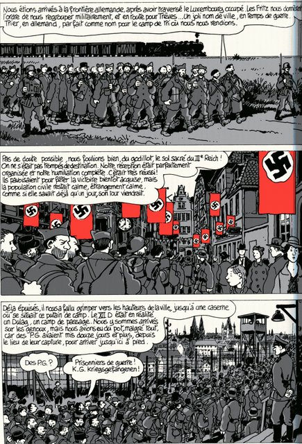 Autre vision amère, celle de Jacques Tardi. Pourtant spécialiste incontesté de la Première guerre mondiale, Tardi a choisi d’évoquer dans une mise en scène où il apparaît jouant le rôle de contrepoint, le trajet de son père, fait prisonnier en 1940 et qui va passer cinq ans derrière les barbelés dans Moi, René Tardi, prisonnier de guerre au Stalag IIB. Manière aussi pour cet antimilitariste convaincu de réécrire à sa façon cette seconde guerre mondiale qui n’en pas fini de remonter à la surface.