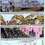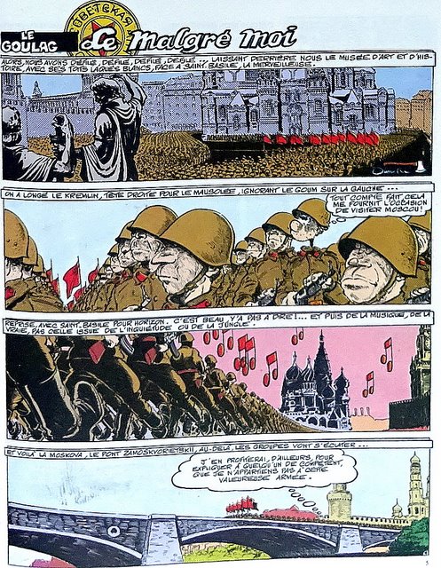 De l’autre côté de la barrière, Guy Moumimoux (qui signera sous le nom de Guy Sajer une autobiographie de sa carrière militaire au sein de la Wehrmacht, lui qui avait fait partie des « malgré nous » alsaciens) va être l’un des rares auteurs à dessiner l’Armée rouge avec un Goulag revisité version humour noir.