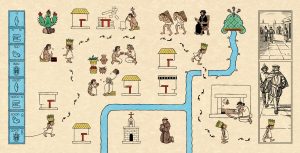 C’est comme ça que j’ai travaillé, mais je n’ai pas eu tellement d’efforts à faire pour m’en emparer, finalement. Sur les codex mésoaméricains, ça m’est beaucoup plus étranger au départ. Il a fallu tenter de comprendre, déjà, ce langage par l’image qui est quand même sophistiqué, qui est assez hermétique, pour nous. J’ai fait plein de lectures, bien sûr. Je me suis laissé guider par des éléments qui étaient plus ou moins familiers, qui pouvaient ressembler à du pictogramme de bande dessinée. Des traces de pas qui indiquent des déplacements, comme des volutes pour la parole.