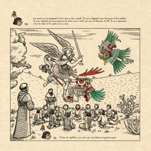 J’ai pris l’habitude de dire que si Jean avait été chorégraphe, on aurait présenté un ballet. Alors, Jean avait croisé le codex de Florence, le codex mésoaméricain et avait éprouvé la puissance graphique de ce matériau-là. Moi, par ailleurs, j’avais travaillé sur le Mexique de la fin du XVIe siècle, aux archives à Mexico, à Séville, et j’avais croisé certains des personnages qu’on voit apparaître dans la BD aussi, comme l’archevêque Pedro Moya de Contreras dont j’avais lu les correspondances manuscrites.