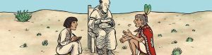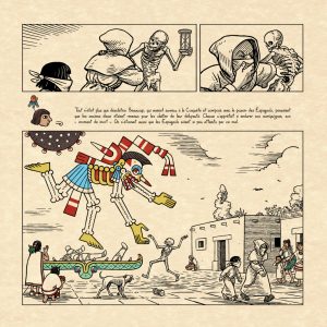 Résumé de l’album : Au XVIe siècle, lors de son arrivée au Mexique, le prêtre franciscain Bernardino de Sahagun déplore la destruction systématique par les conquistadores de la culture autochtone. Il se lance dans la rédaction d’un recueil monumental, transcription de la mémoire aztèque. Un jeune Indien, Antonio Valeriano, né après la Conquête, l’aide dans sa tâche et découvre, chemin faisant, sa culture d’origine…