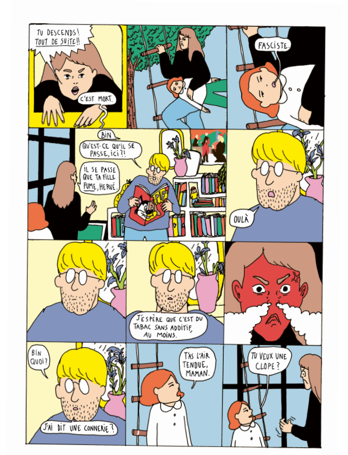 Pour continuer à propos de cette question, à propos de cet humour et des aventures dont on parlait, l’humour parvient souvent sous forme de mises en scènes et dialogues. Je pense, de manière personnelle, à Ernestine qui traite sa mère de fasciste parce qu’elle se retrouve punie pour avoir fumé ou Ancolie qui répond à son ex qu’elle « est sur le coup » à propos de coucher avec sa mère (à lui). Pourtant, il y a toujours une certaine morale et critique de notre société à travers tes textes. Comment tu définirais, si tu voulais les définir (en termes de genres narratifs) ces deux bandes dessinées ? Est-ce que c’est plus de l’humour…