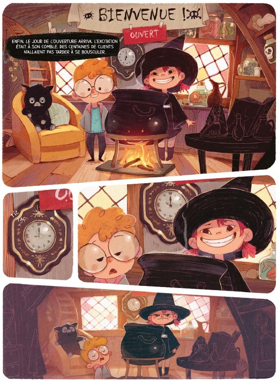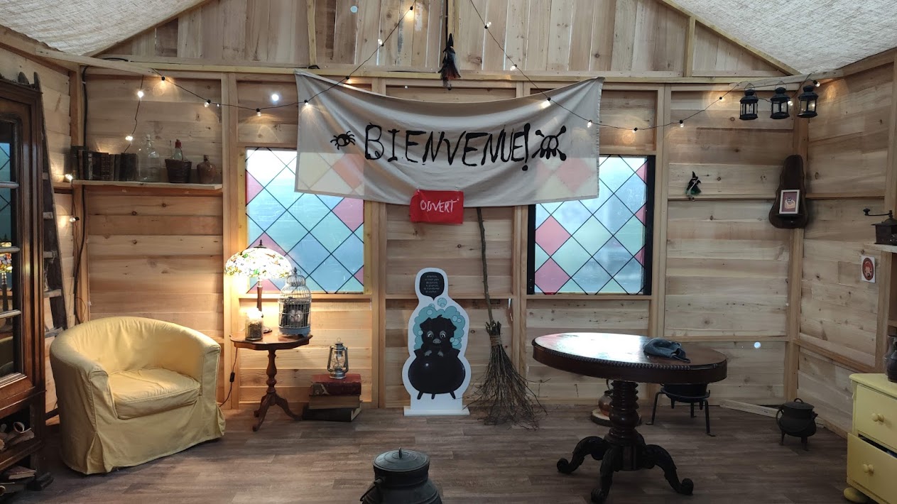 Gilles Hautière : On voulait vraiment entrer dans son univers. Donc on a reproduit sa boutique de sorcières. Là, on a essayé d’être le plus fidèle possible. On le voit sur une petite planche à l’accueil. Alors, on n’a pas pu faire exactement ce qu’il y a dans la bande dessinée, parce que ce n’est jamais possible de refaire à 100%. Mais on a essayé de reprendre le même motif sur les vitraux. On a refait la banderole de bienvenue. On a mis le fauteuil jaune qui est là-bas. Il ne manque le feu. Malheureusement, pour des raisons de sécurité, ce n’est pas toujours possible. Même si on a ignifugé la cabane.
