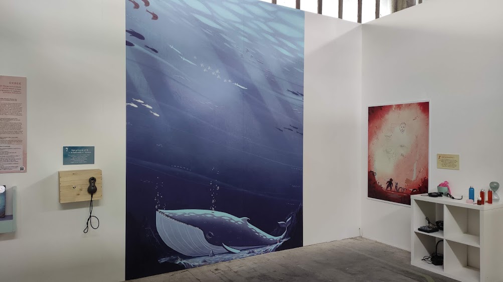 Marie Cavanne : C’est vrai que ça aurait pu être facile de mettre simplement des boîtes pour l’écoute. Mais non, parce qu’à chaque fois, il y a un but recherché. L’idée, c’était aussi de faire attention à la pollution sonore. Il y a beaucoup de bruit dans la halle Freyssinet. L’acoustique a été une question importante parce qu’il ne fallait pas gêner les autres expositions.