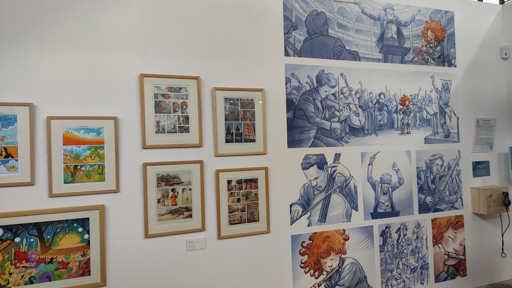 Marie Cavanne : Dans la salle qui présente la série, on découvre des informations sur chaque bande dessinée, leurs auteurs et autrices, sur La Gouttière et sur l’Orchestre de Picardie.