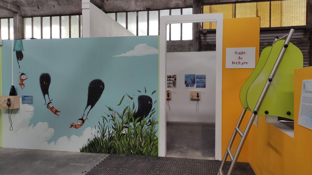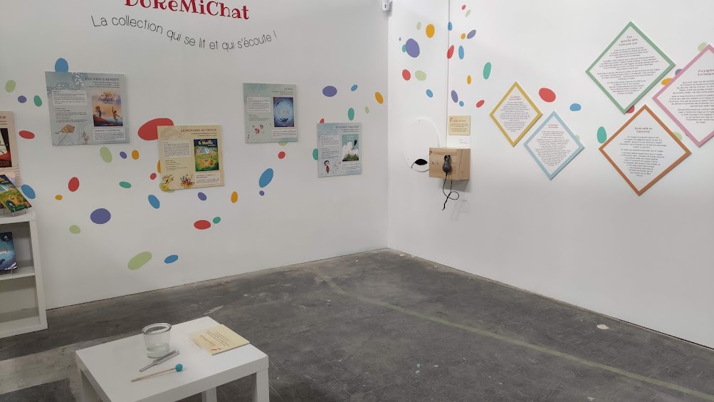 Marie Cavanne : La dernière salle de l’exposition Do Ré Mi Chat est ma salle préférée, celle pour la détente. Dans cet endroit, on peut écouter et lire des livres grâce aux Bookinou. Ainsi on peut se poser un petit peu avant de repartir.