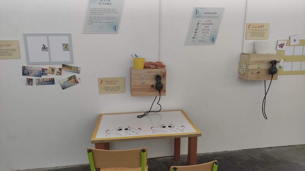 Et puis, pour les expositions jeunesse, on ne peut pas mettre le son trop fort. Avec ces boîtes à sons, on peut s’approcher, s’écarter et régler le volume de cette façon. C’est amusant, pour les petits.