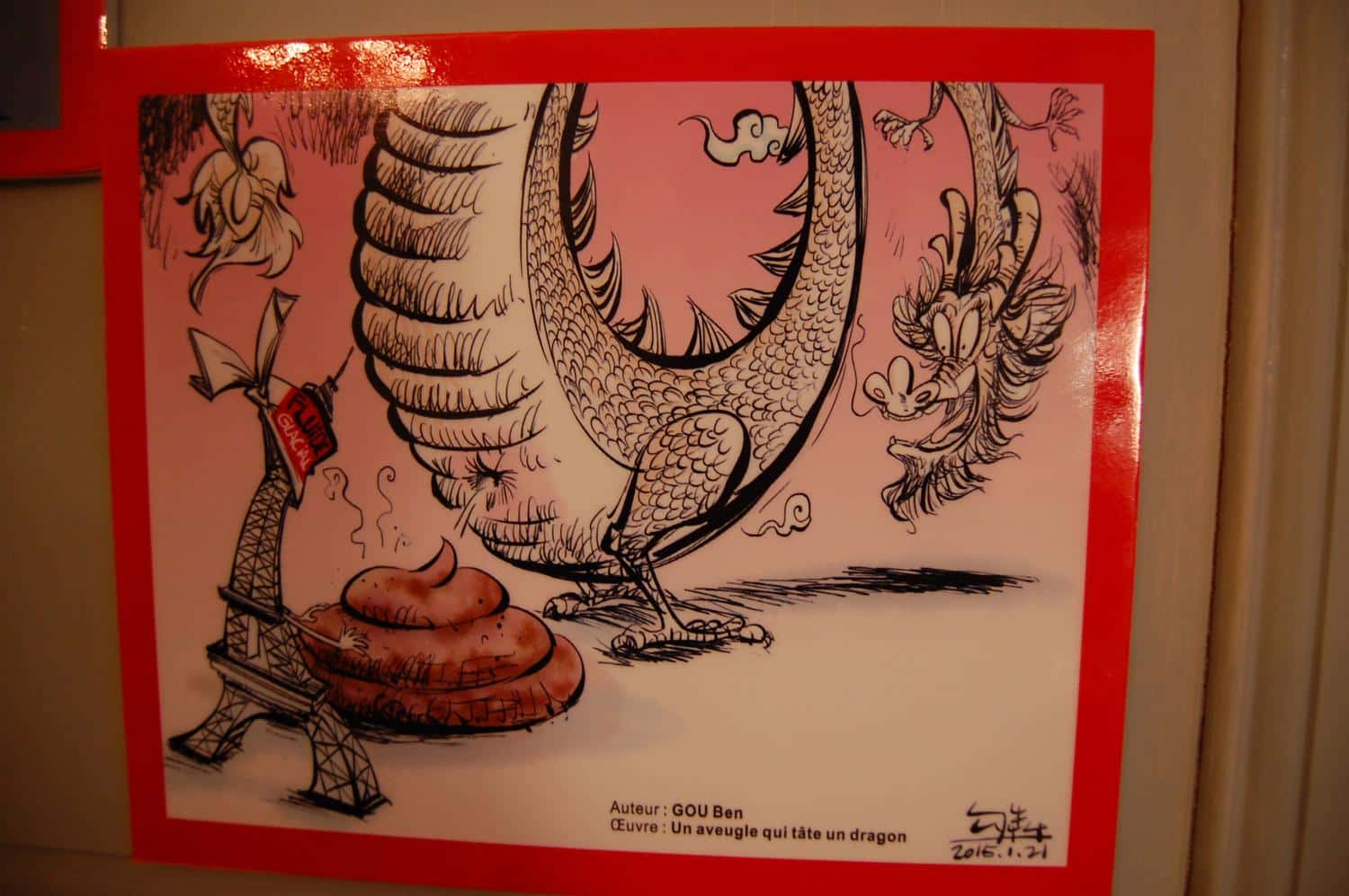 Il y a cet autre dessin intitulé « aveugle tâtant le dragon ». Compréhensible en soi: la tour Eiffel représente la France, le dragon la Chine… mais tellement plus appréciable quand on connait la parabole des six aveugles tâtant un éléphant, base du Jaïnisme, qu’un chinois aura beaucoup plus de chance de connaitre qu’un français.