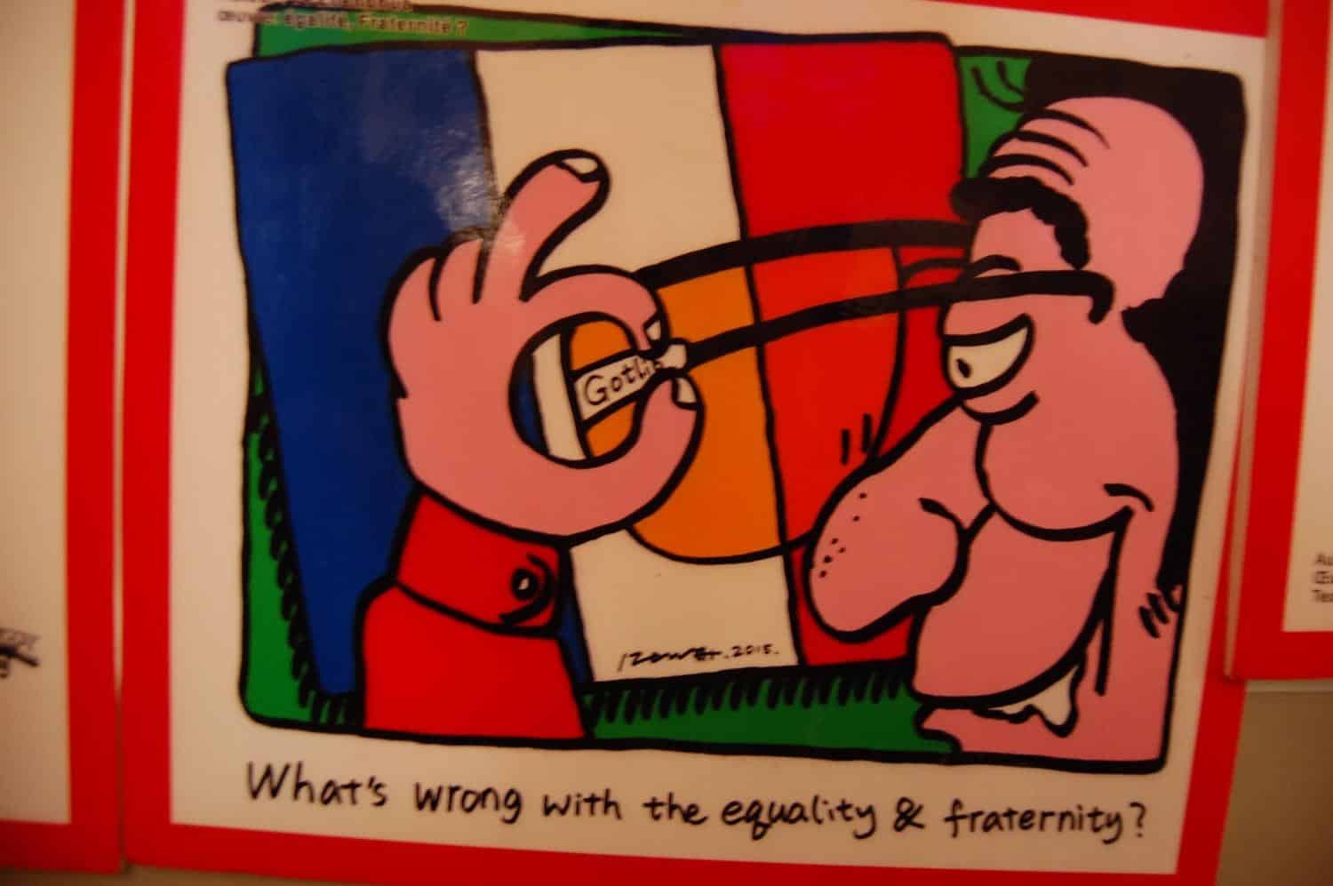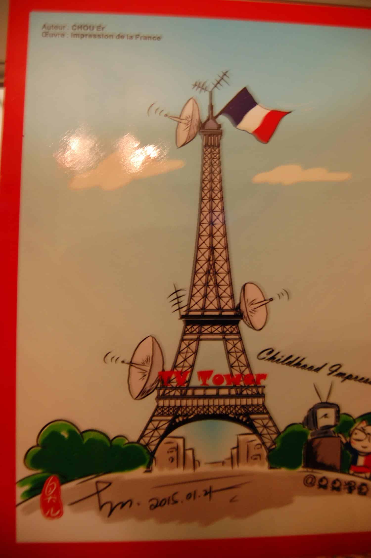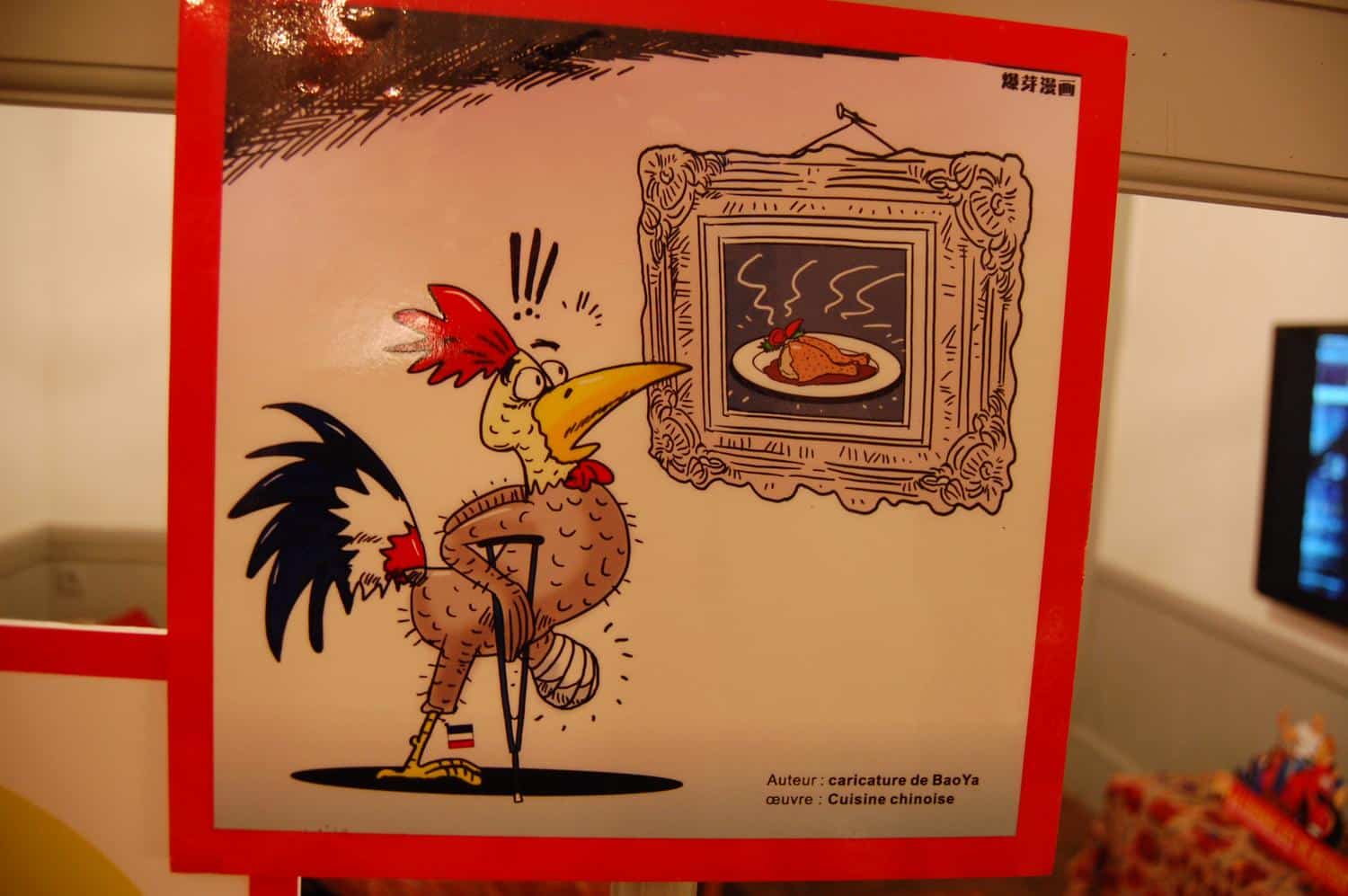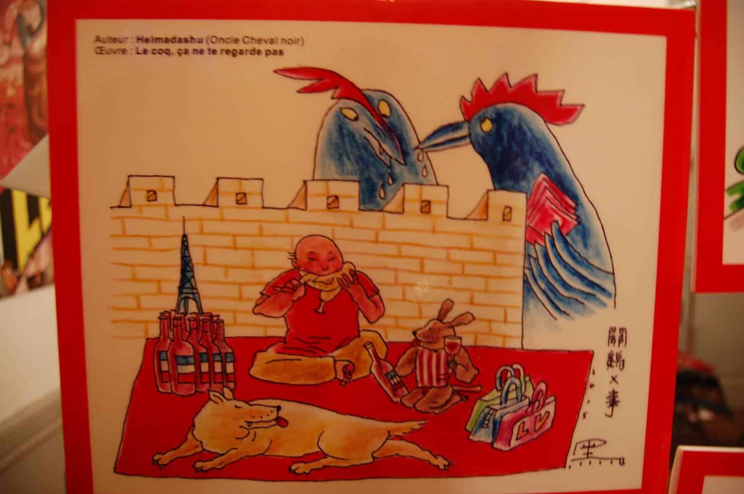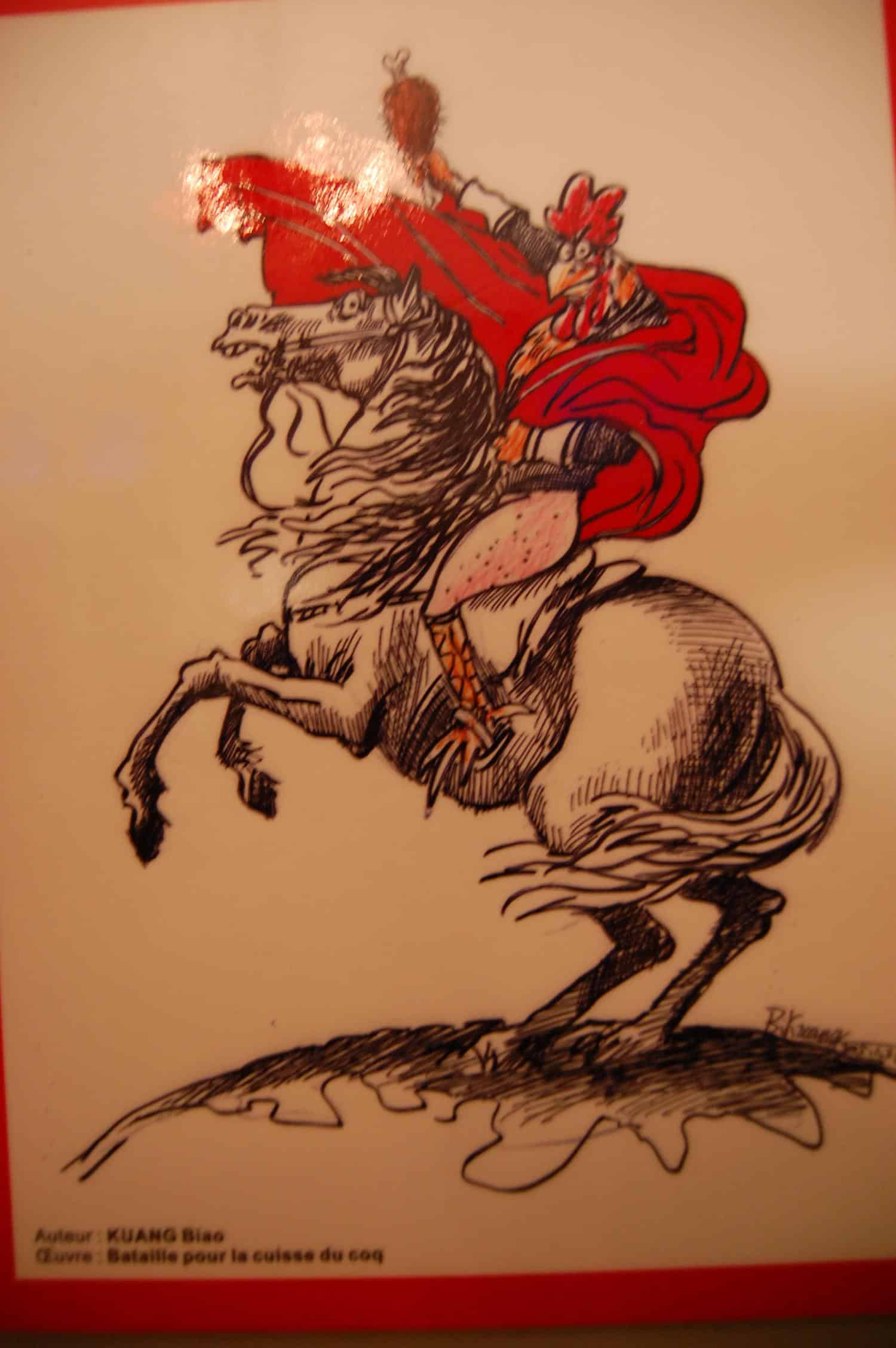 Car tout comme les chinois n’ont pas forcément compris l’humour français, les français restent un peu paumés face aux blagues chinoises, et à l’avalanche de codes et symboles utilisés. Sur les dessins chinois s’alignent des coqs, des tours Eiffel très phalliques, une parodie de Bonaparte franchissant le Grand-Saint-Bernard par David que tout français saura reconnaitre plus ou moins consciemment… Autant de symboles de la France, réutilisés avec plus ou moins de bonheur. Au final, que nous disent-ils? Que la Chine a toujours un peu de mal à se moquer d’elle-même? On pourrait le croire.
