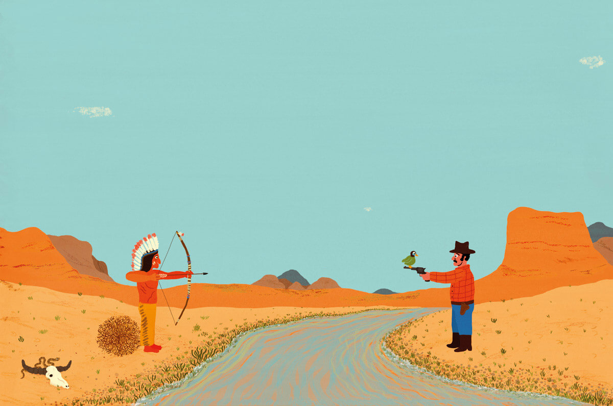 Dans un désert américain et sous un soleil de plomb, un cow-boy et un indien se font face. Chapeau sur la tête et armé d’un revolver contre un bandeau à plume et un arc, tout est prêt pour un duel à mort. Séparés par un petit ruisseau, ils sont là stoïque attendant la fin. C’était sans compter sur la nature qui va les rattraper : serpent, bison, train… Tout les dérange dans ce moment qui se voudrait sanglant…