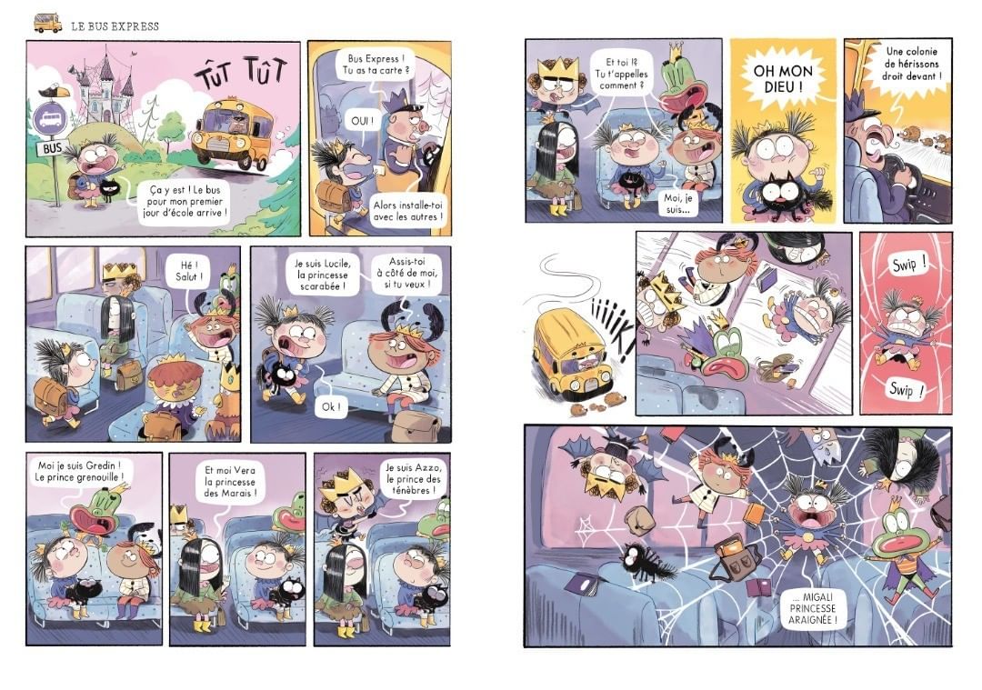 Dans le bus, Migali fait la connaissance de Lucile la princesse scarabée, de Gredin la grenouille, de Véra la princesse des marais et d’Azzo le prince des ténèbres. Il y a même Rex-Emilien, la brute épaisse pas très futée. Tout ce petit monde visite l’Académie, prend ses marques et commence à suivre les cours…
