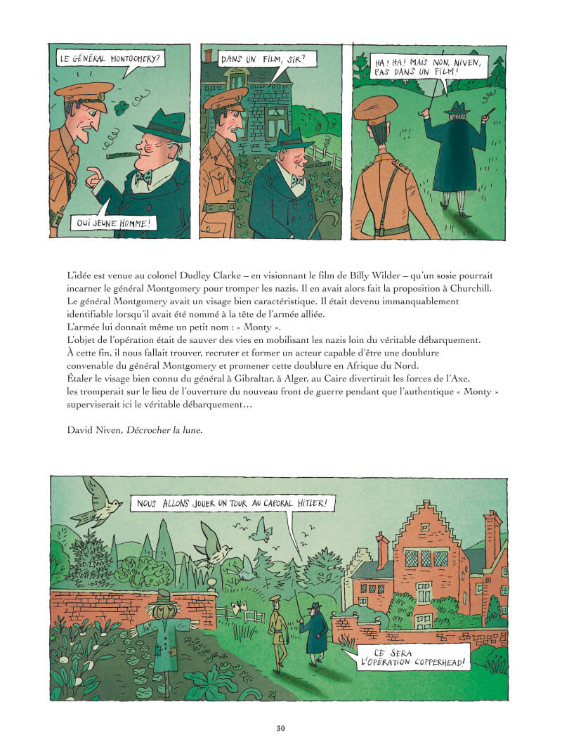 Cette petite histoire qui raconte la grande Histoire plaît de suite par les personnages décalés, parfois naïfs, parfois maladroits mais très attachants. Le lecteur croise aussi Churchill et ses phrases de génie ou le vrai Montgomery. L’ambiance pesante de la période (Londres est bombardée) semble pourtant douce dans l’album par un humour joyeux. La guerre est donc présente mais aussi l’industrie du cinéma qui se range du côté des gouvernants (cf Leni Riefensthal en Allemagne, Donald aux USA) prêt à tout pour aider à l’effort de guerre par une propagande grossière. En effet, il fallait détourner le regards des Nazis vers l’Afrique du Nord alors que le Débarquement en Normandie allait se dérouler (faire croire que Montgomery y était encore).