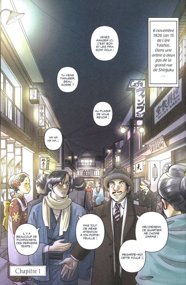 En mettant en scène les marginaux et les prostituées, Kan Takahama (Le goût d’Emma) leur rend un bel hommage, tels les mangas dans la veine des ero-guros. Il sous-entend ainsi la place de la femme dans cette société très conservatrice du début du XXe siècle (un sujet encore important aujourd’hui). L’humour émaille cet album, ce qui lui confère aussi quelque chose de touchant.