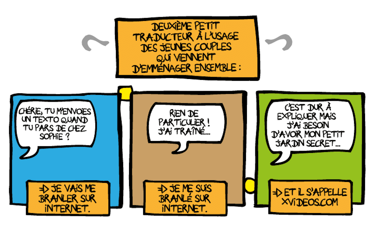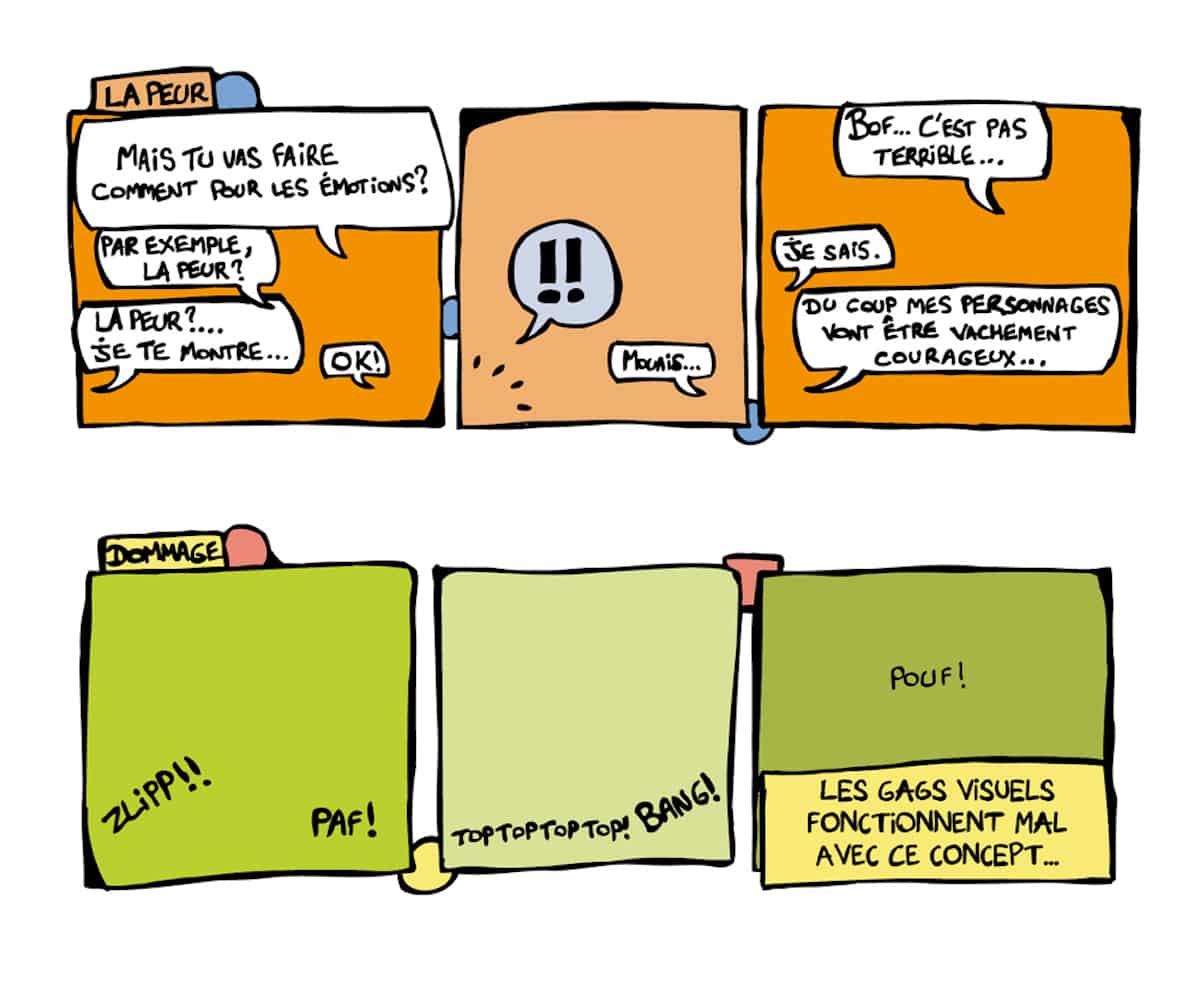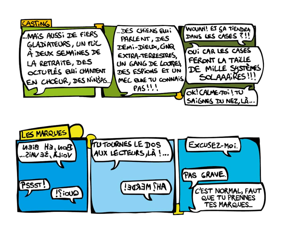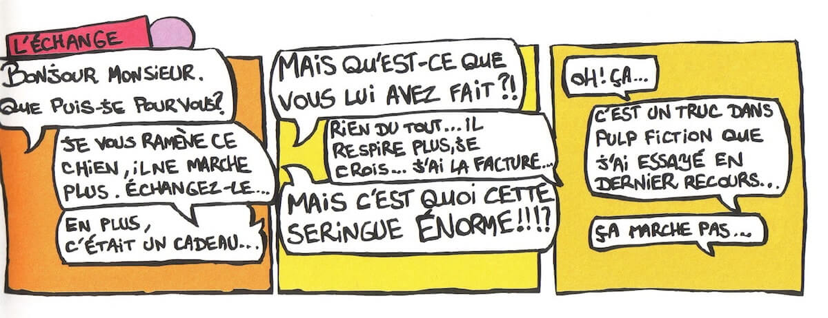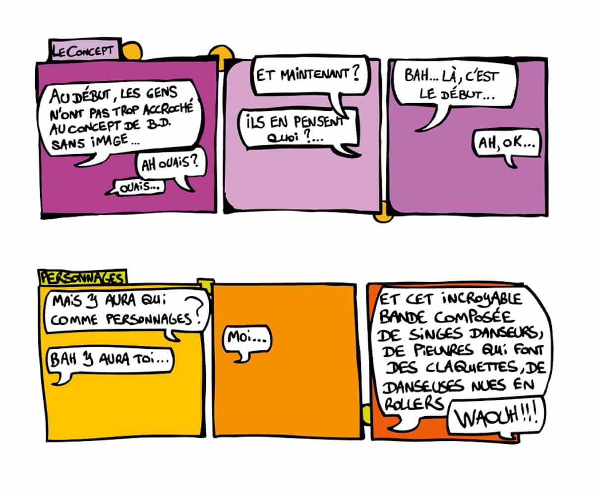 Et puis justement, non. Comme il ne sait pas dessiner, il faisait de la bande dessinée sans dessins. Des dialogues, en fait. Juste des phylactères en supensions. Et c’était déjà bien drôle.