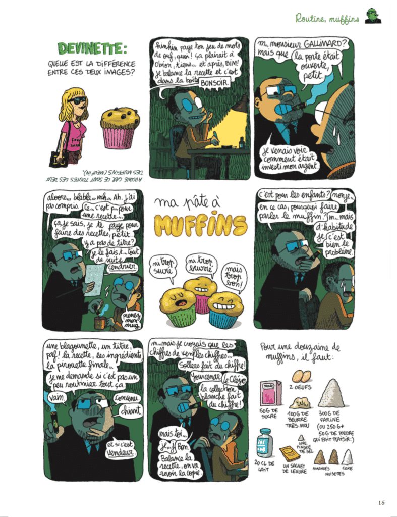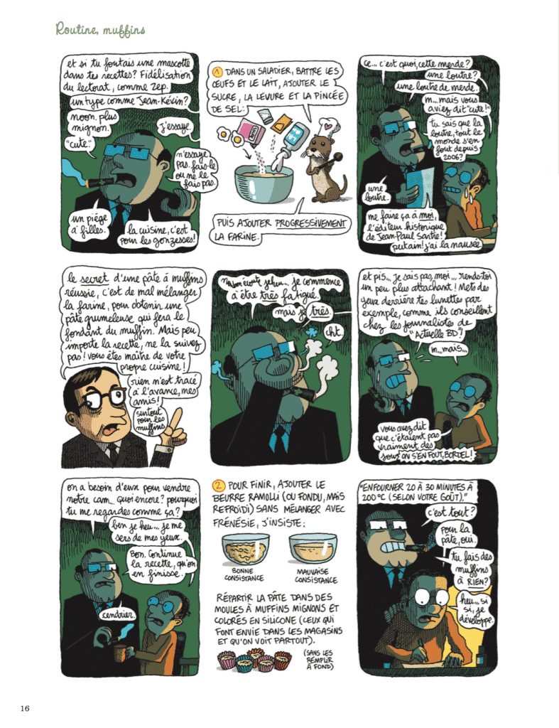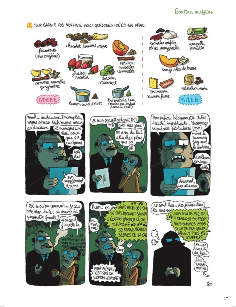 Les recettes vont du plus simple (soupe froide courgette-menthe feta, ci-contre) au plus compliqué (Pintade sur canapé, par exemple). Guillaume Long revisite aussi de façon romancée des plats incontournables (exemple avec Les pâtes carbo’ de Jean-Kévin, épisode suivi du procès de Jean-Kévin, et de la recette officielle du Bureau de Contrôle de la Carbonara).