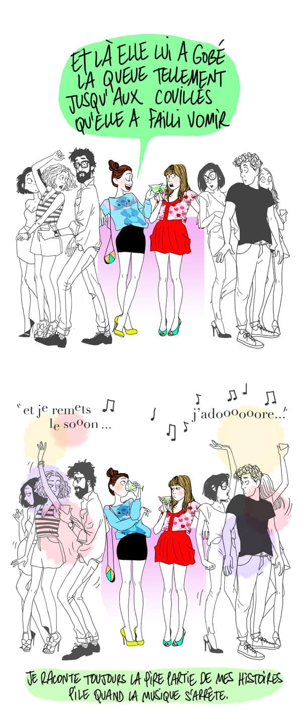 Et puis il y a le dessin, aussi. Fin, élancé et très expressif, il se situe quelque part entre les Parisiennes ultrasophistiquées de Kiraz et les filles plus décontractées de Pénélope Bagieu. Un dessin ultra-bankable pour le monde de la pub, certes, mais qui vaut vraiment le coup d’œil, et qui contribue à cet effet de décalage entre le fond et la forme.